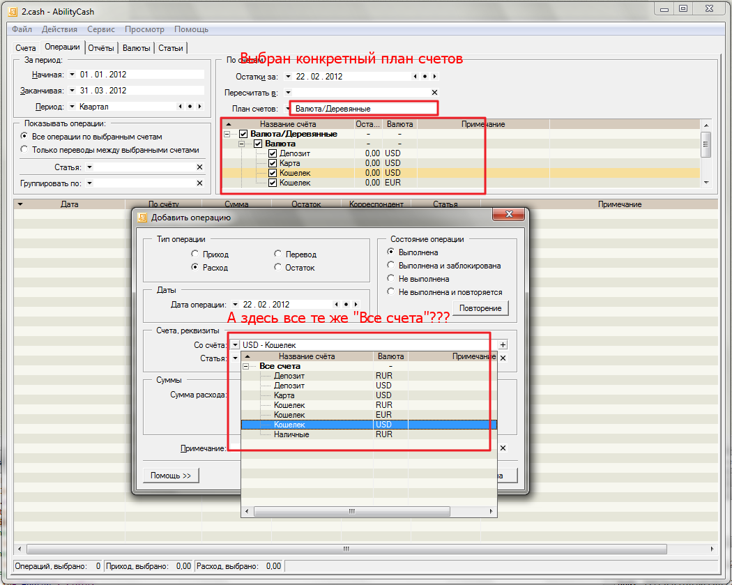 Правильным было бы либо добавление возможности выбора "плана счета" в окне добавления операции с сохранением последней настройки; либо использование "плана счета", что сохранен в "развернутом списке счетов"; либо, если "развернутый список счетов" не используется, использовать план счета с вкладки "Счета".