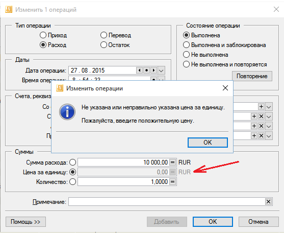 при попытке изменить тип ранее введенной операции "Остаток" на "Расход" поле "Цена за единицу" обнуляется и не позволяет завершить операцию с выдачей ошибки "Не указана, или не правильно указана цена за единицу..." при этом поле "Цена за единицу" не активно по умолчанию...